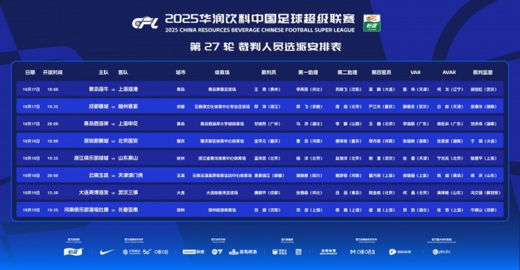 10月18日讯 据博主“裁判 圈”报道,中超第27轮云南玉昆vs天津津门虎,将首次出现三名女裁判 同场执法。