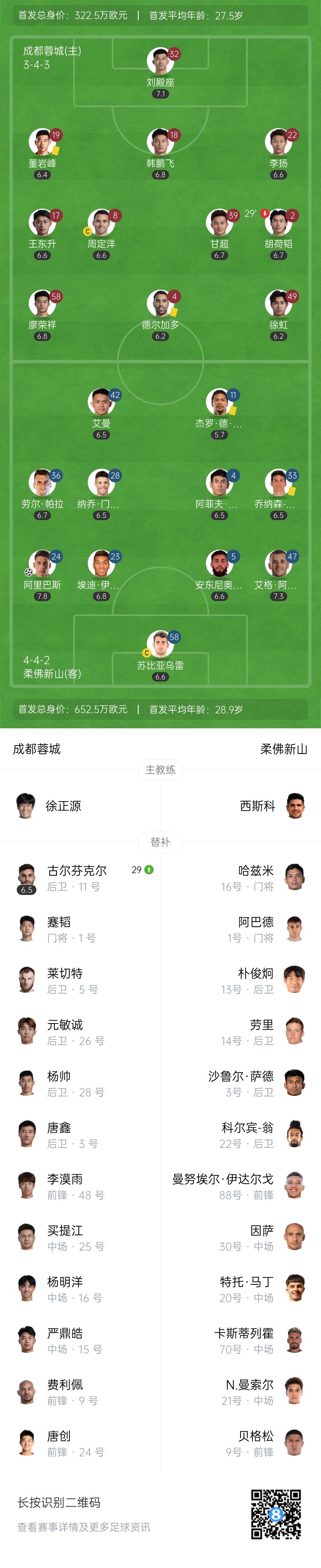 第27分钟,成都蓉城前场定位球,甘超主罚开到危险区域 内,李扬顶球攻门顶偏了↓