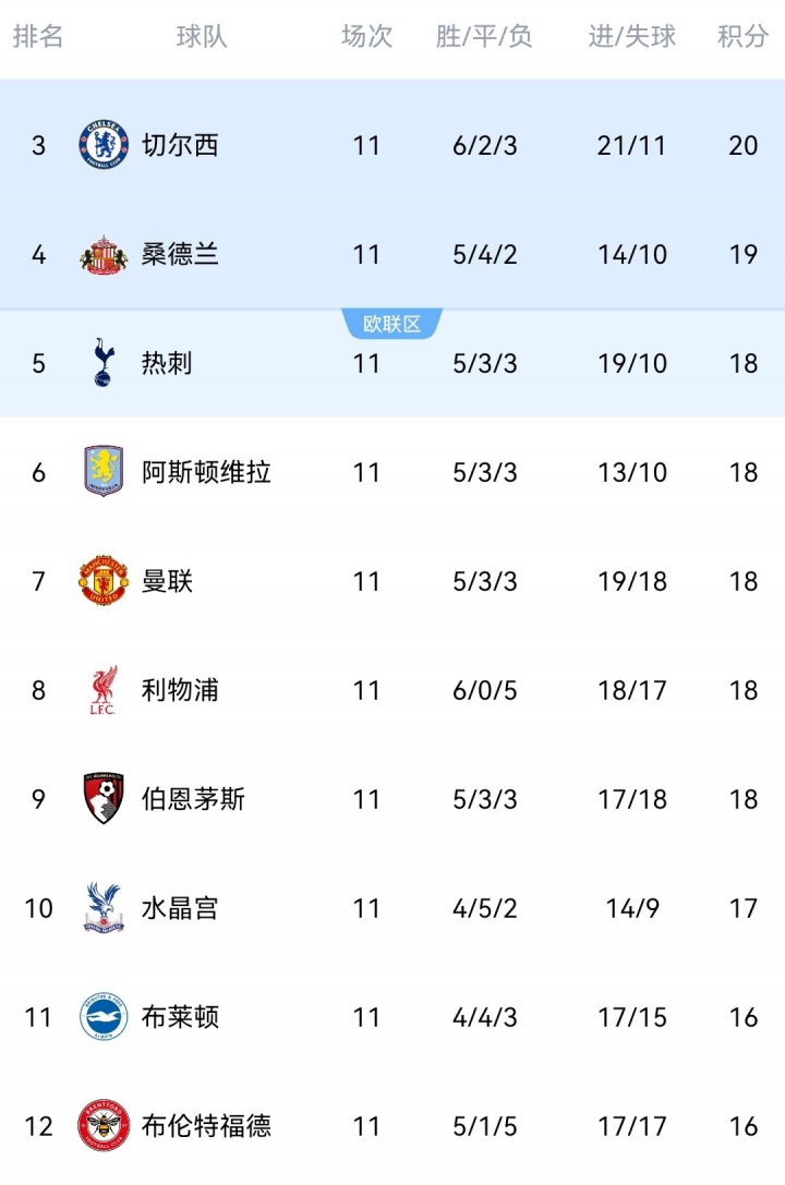 11月10日讯 英超11轮赛事 结束,在积分榜上,中上游球队角逐 剧烈 ,从第3名的切尔西到第12名的布伦特福德,分差仅有4分。