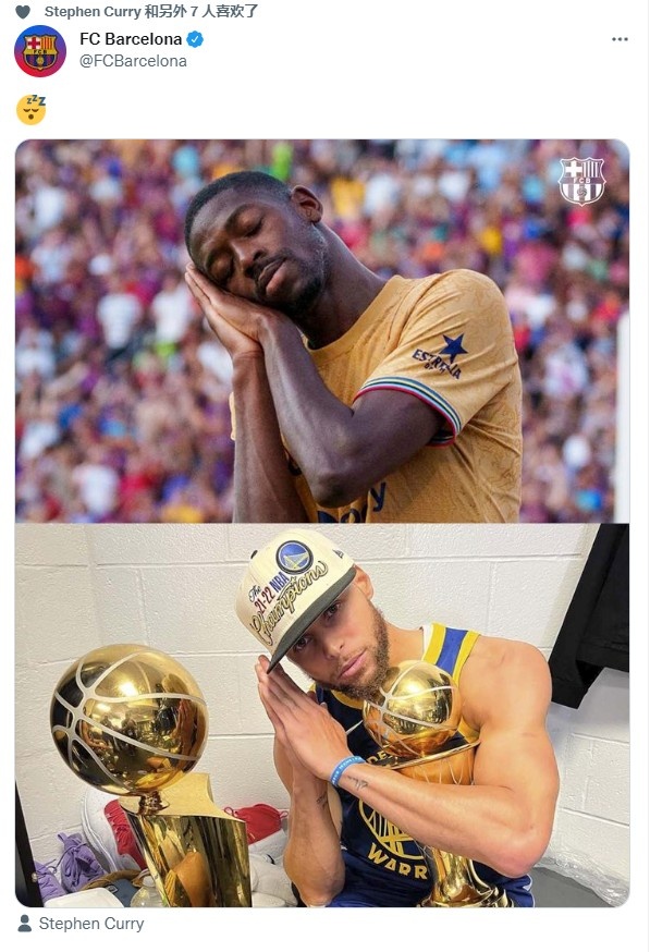 在跟赞助商阿迪达斯的宣传像中,登贝莱再次做出了库里的“晚安”庆祝姿势;