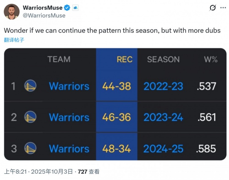 10月3日讯 勇士自媒体WarriorsMuse晒出了勇士过去三个赛季的战绩,具体如下: