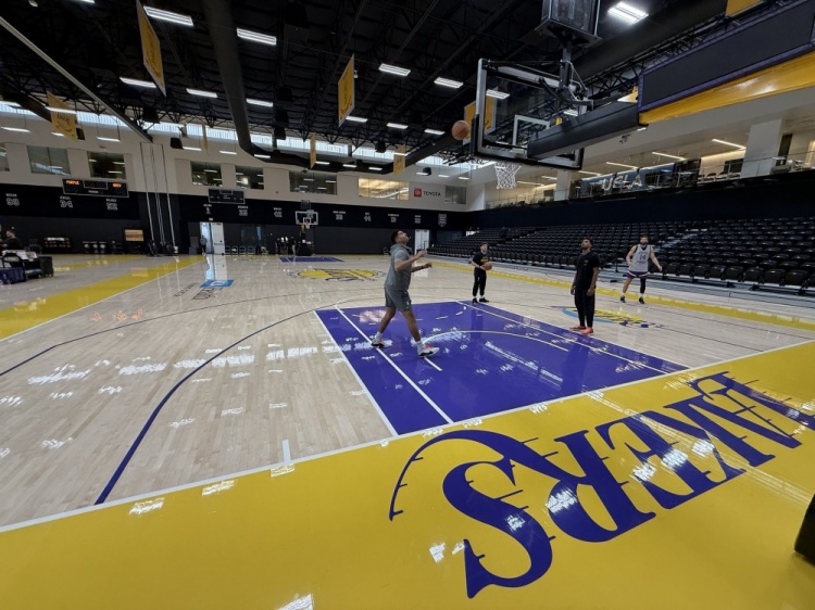 10月10日讯 昨日,湖人记者Jovan Buha晒出湖人练习 场的照片,并提到在三分线内多了一条“两分线”。