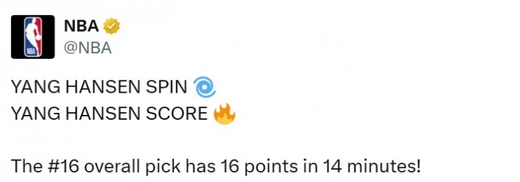 官方认证!NBA官推:杨瀚森出色 回转 火力全开 16号秀14分钟砍16分