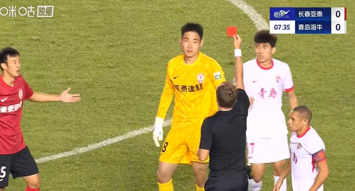 09月27日讯 亚泰vs海牛赛事 第8分钟,亚泰守门员王智峰出击撞到对方球员兰克尔-泽,CCTV5直播在线观看高清免费被直接驱逐 罚下。