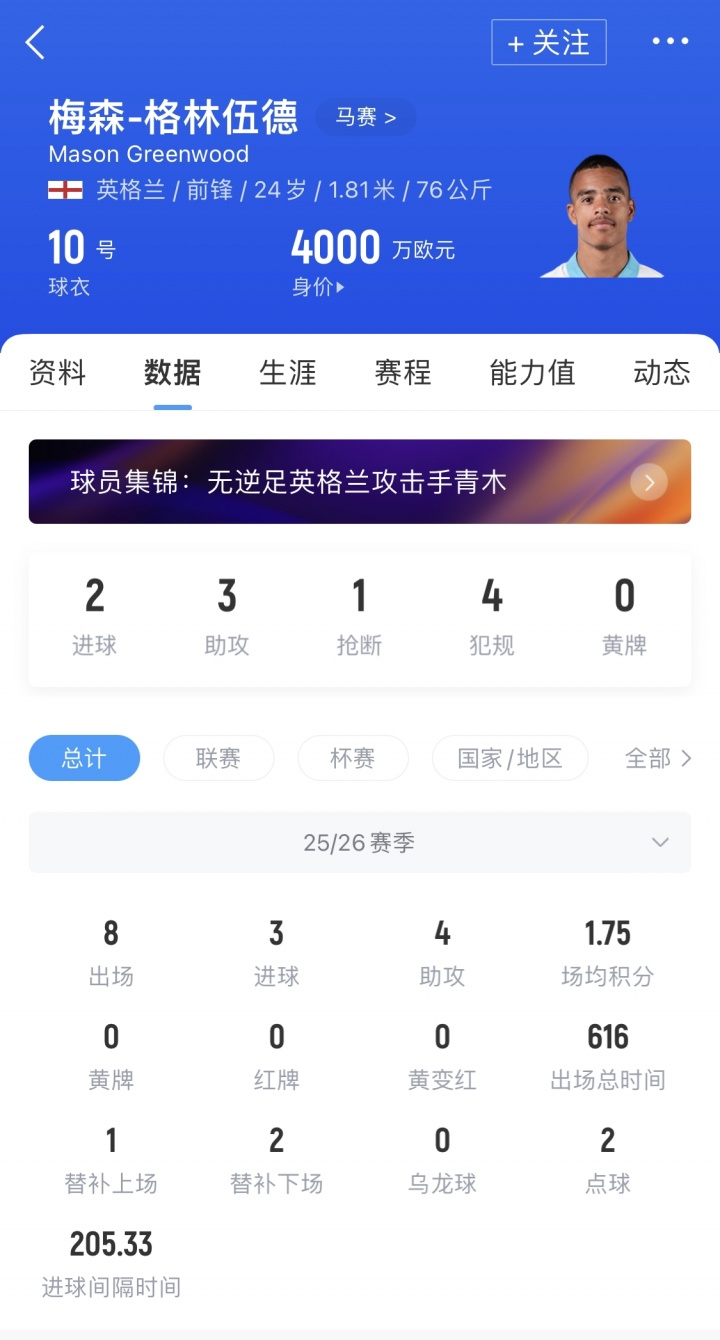 上赛季结束,格林伍德身价已回升至4000万欧,亚洲杯直播cctv5排名队内第一。本赛季他在马赛延续良好表现,职业联赛 与欧冠一共8场赛事 收获3球4助。