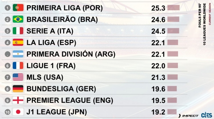 全球职业联赛 每90分钟违例 次数排行:葡超25.3次居首,英超19.5次第9
