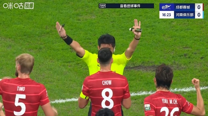 胡荷韬破门,CCTV5直播在线观看高清免费但裁判 认定河南队手球运动 在先得分 无效,判给蓉城定位球。随后蓉城指导教练员组抗议吃到警告 。