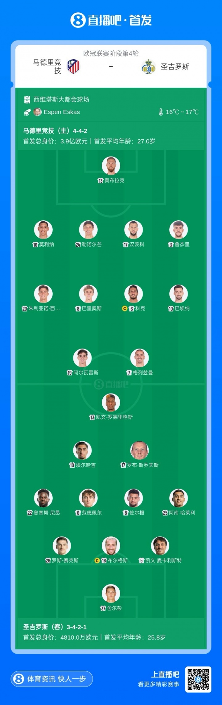 马竞vs圣吉罗斯杆位:格列兹曼搭档阿尔瓦雷斯 巴埃纳、科克出战