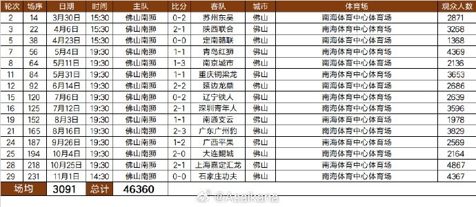 2025中甲职业联赛 佛山南狮队现场观赛人群 人数统计:合计46360人次,24直播网场均3091人。