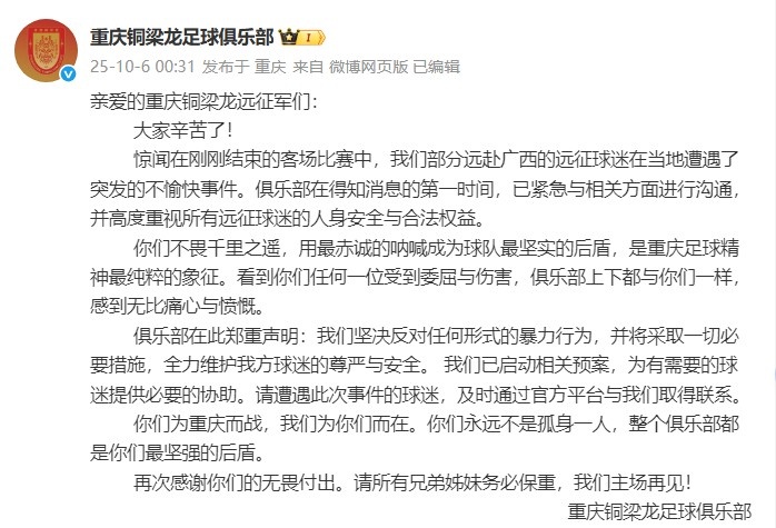 重庆铜梁龙声明:坚决反对暴力行为,全力维护我方球迷尊严与安全