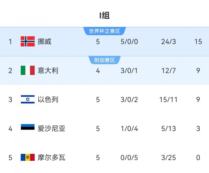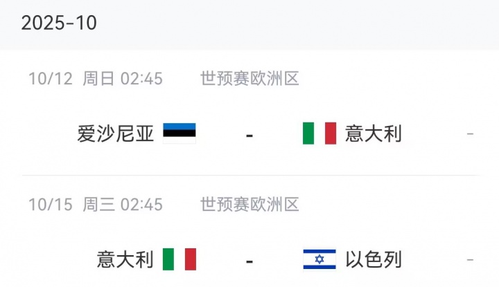 意大利目前的世预赛出线形势并不乐观:他们少赛一场追赶 小组排名第1的挪威6分。10月12日,他们将客场应战 应战 爱沙尼亚;10月15日,他们将主场作战 迎战以色列。