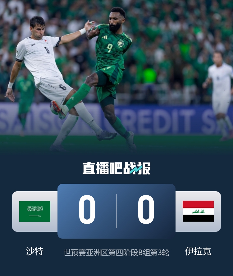 世预赛亚洲区第四阶段B组第3轮,沙特0-0战平伊拉克,晋级下一轮 2026年世界杯赛 正式比赛。