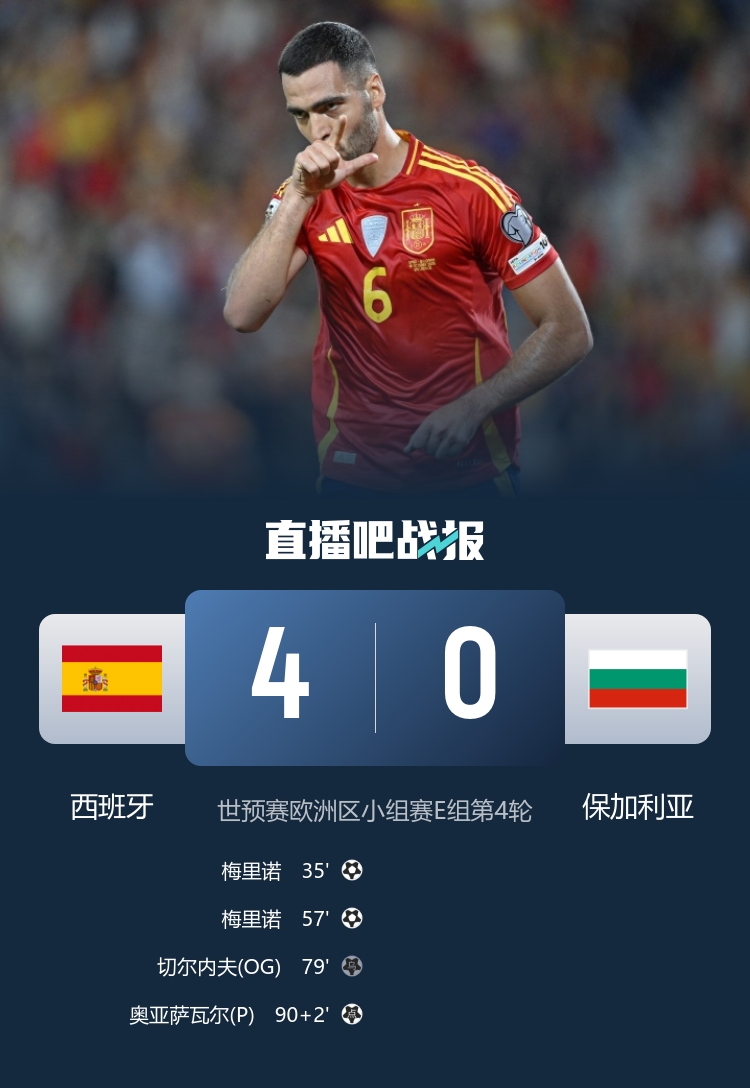 世预赛欧洲区小组赛E组第4轮,西班牙4-0大胜保加利亚,梅里诺连进两球。