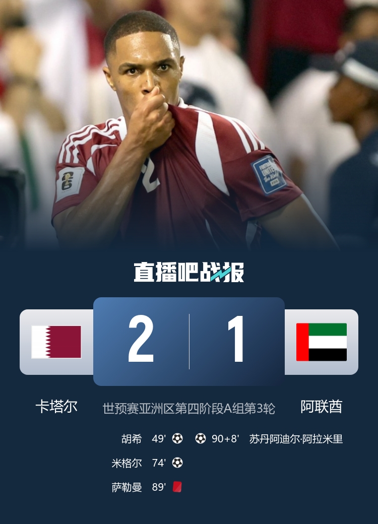 世预赛亚洲区第四阶段A组第3轮,10人卡塔尔2-1战胜阿联酋,晋级下一轮 2026年世界杯赛 正式比赛。