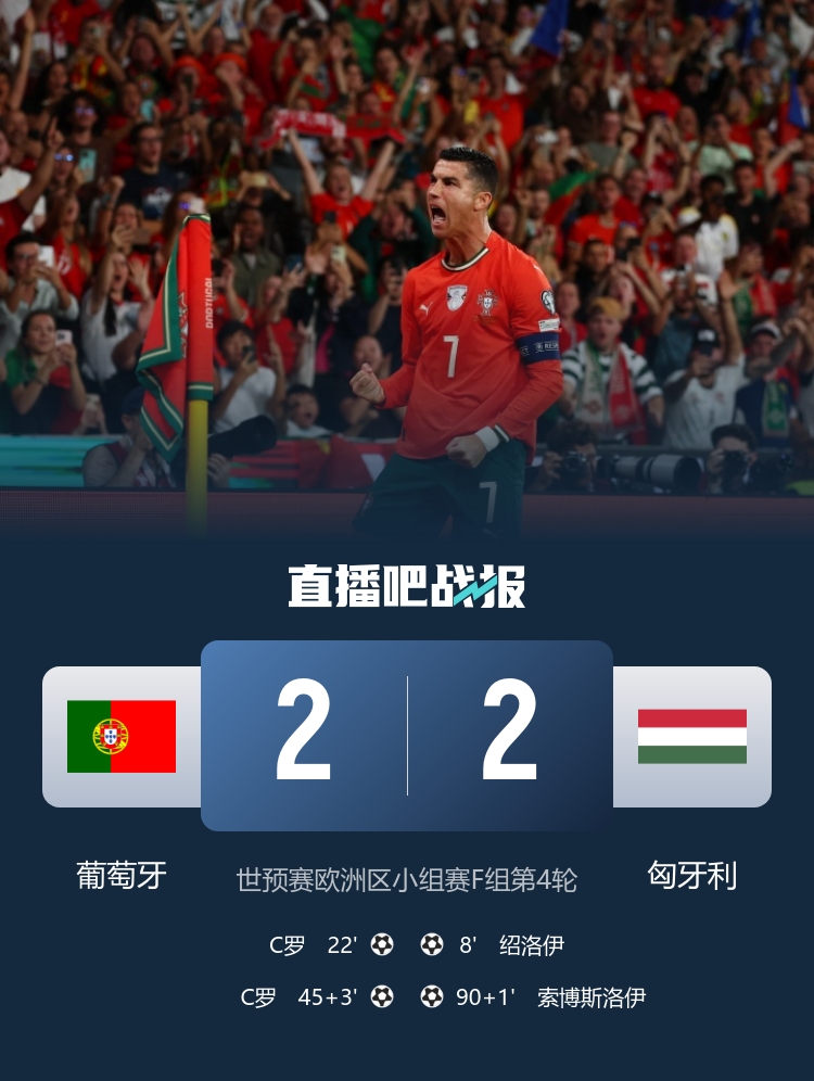 世预赛欧洲区小组赛F组第4轮,葡萄牙2-2匈牙利,无缘本轮晋级下一轮 世界杯赛 正式比赛,C罗连进两球。