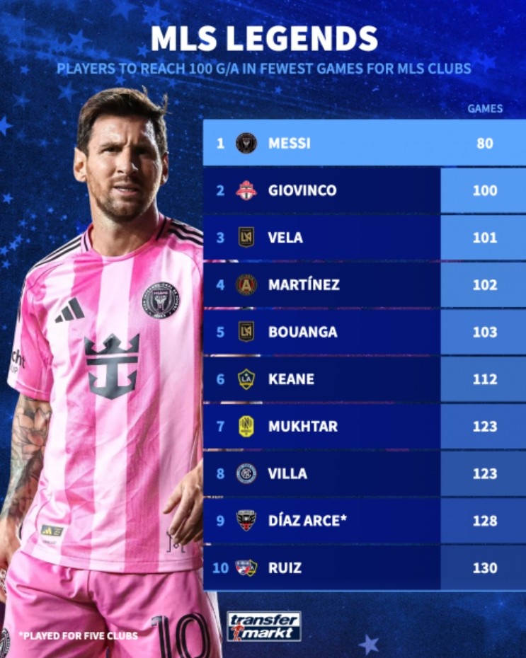 美职联球员加入 百运动活动 场 次排行:梅西80场最快,第二乔文科100场