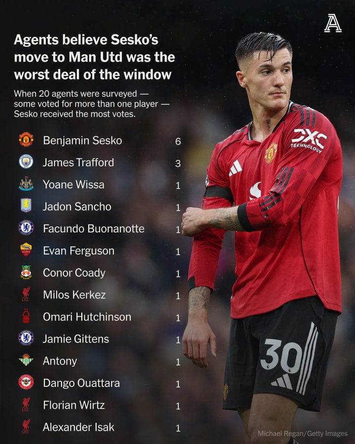 20位经纪人中,有6位将英超夏窗最差转会投给了曼联花费7650万欧元签下舍什科。一位经纪人表示:“转会费太高而且时机过早。”另一位声称:“曼联是被迫完成这笔签约的。”第三位则评价道:“花费如此高的转会费,只换来了平庸的战力。”