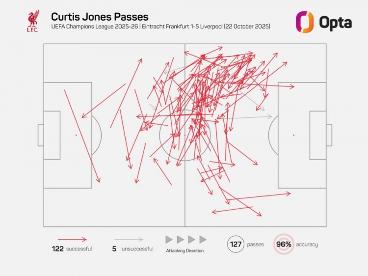 琼斯成功传送球 122次,创造03-04赛季以来利物浦欧冠单场记录