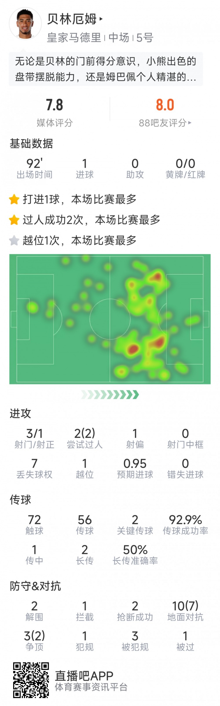 贝林厄姆本场数据:打进制胜球,3射1正,2次关键传送球